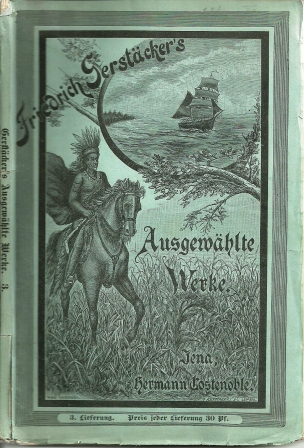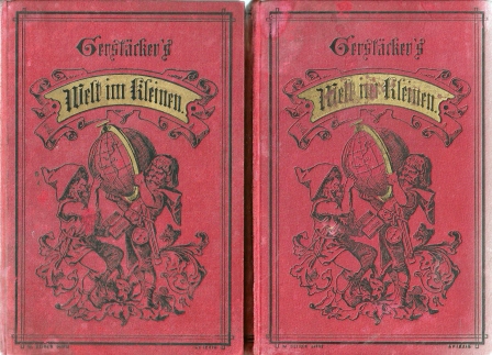 Links: Reisen um die Welt. Ein Familienbuch. Leipzig, Verlag von Bernhard Schlicke. Dritte verbesserte Auflage 1871, ingesamt 4 Bände in zwei Bänden mti diesem Deckelbild aufgebunden. Rechts im grünen Einband: Außentitel Gerstäckerund A.W. Grube, Weltreisen. Innentitel: Friedrich Gerstäckers Reisen um die Welt. Unter Berücksichtigung der neueren Forschungen bearbeitet und herausgegeben von A.W. Grube. Fünfte, wesentlich verbesserte Auflage, Leipzig, Verlag von Bernhard Schlicke (Balthasar Elischer). 1882. Verbessert wurde aber leider nicht die Papierqualität dieser Auflage. Die Holzschnitte sind in den früheren Auflagen erheblich deutlicher in den Details. Uns liegt außerdem vor: Reisen um die Welt. Ein Familienbuch von Friedrich Gerstäcker. Vierte, genau durchgesehene und verbesserte Auflage. Leipzig. Verlag von Bernhard Schlicke. 1876. Leider kein Prachteinband mit Prägung, dafür aber als Halblederausgabe. Gerstäcker selbst hatte noch die 3. Auflage 1870 überarbeitet und neu herausgegeben.
