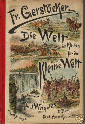 Friedrich Gerstäckers Welt im Kleinen für die Kleine Welt. Bearbeitet und herausgegeben von A.W. Grube. Dritte, wesentlich verbesserte Auflage. Leipzig, Verlag von Bernhard Schlicke (Balthasar Eltscher), 1892. In diesem ungewöhnlichen Einband liegen uns vor: Bd 3, Nordamerika u. Bd. 4, Südamerika sowie Bd. 5, Polynesien und Australien( Bd 6, Asien / Bd 7 Afrika